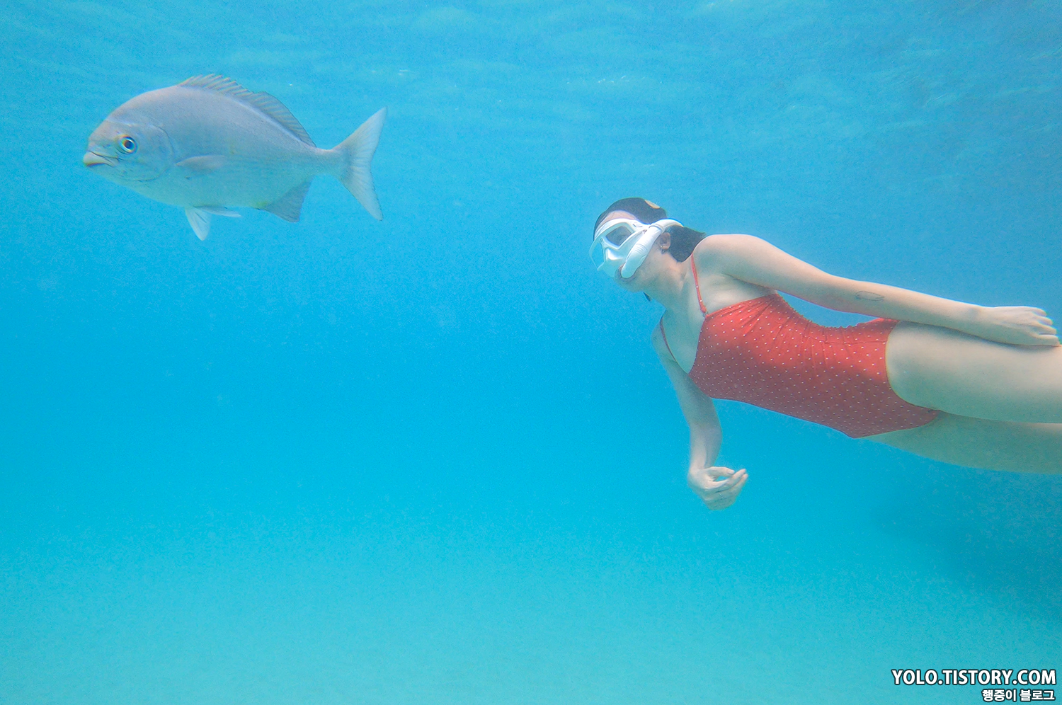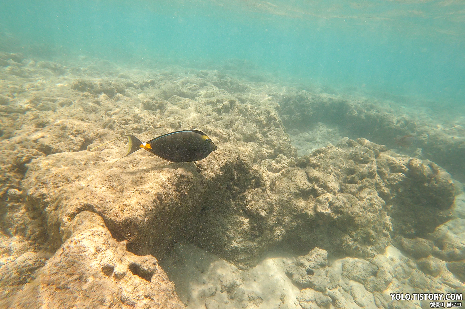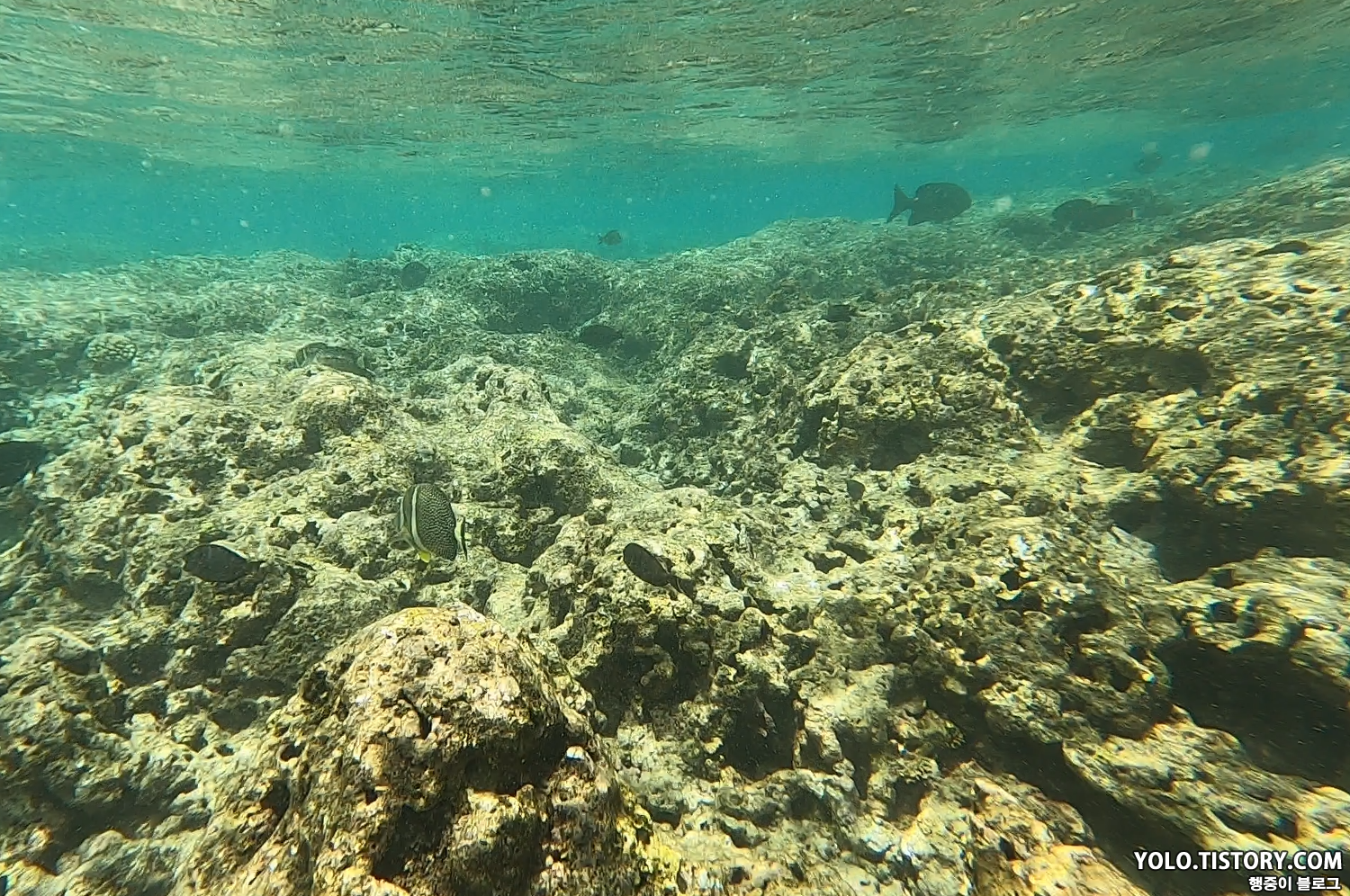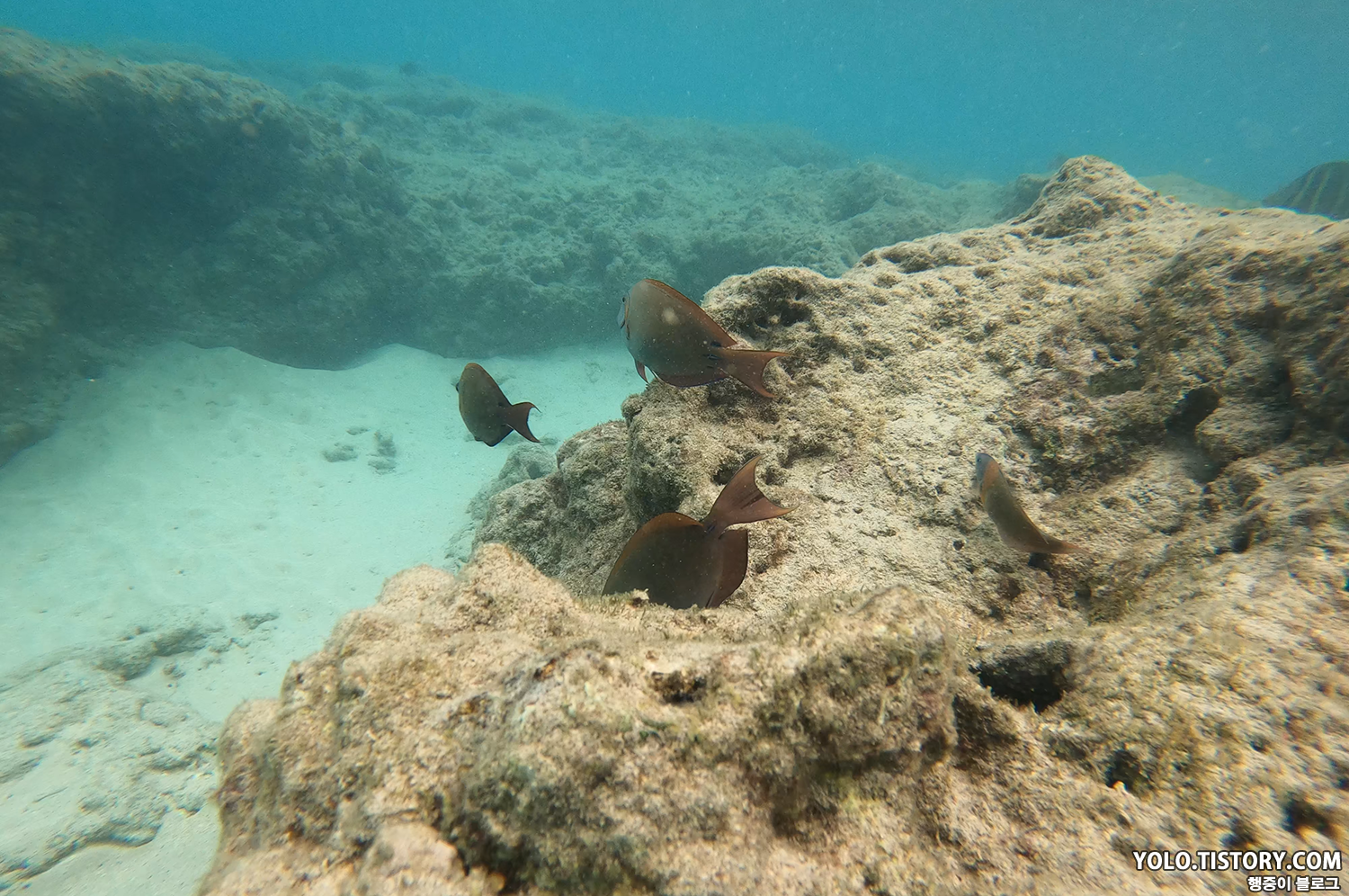 하와이에 와서 봤던 물고기들은 저리 가라 할 정도로 많은 물고기를 보았다. 돌이 많아 수심이 얕은 곳에 물고기들이 특히 많아서 그쪽 위주로 다녔는데 성인이 헤엄치기엔 너무 얕아 바닥과 부딪힐 수 있는 위험이 있었다.