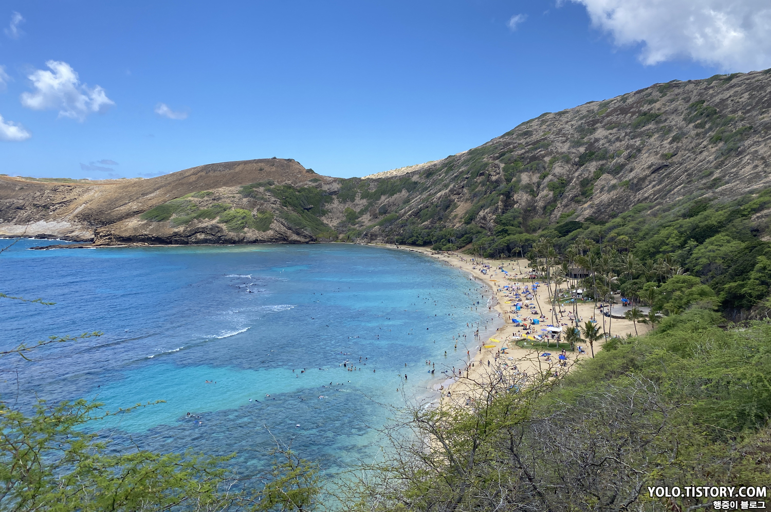 그리고 입장! 트램이 있는데 내려갈 땐 유료이고 올라올 땐 무료였던 걸로 기억한다. 5분이면 내려가고 경치가 좋기 때문이 걸어 내려갔다. 하나우마의 뜻은 curved라는 뜻이다. 즉, curved bay로 모양 그대로를 나타내는 이름이었다. 바람이 많이 불고 구름 낀 날씨라 물놀이하기엔 약간 쌀쌀했다. 화산 지형이라 어느 부분은 모래이고 어느 부분은 돌로 가득했다.