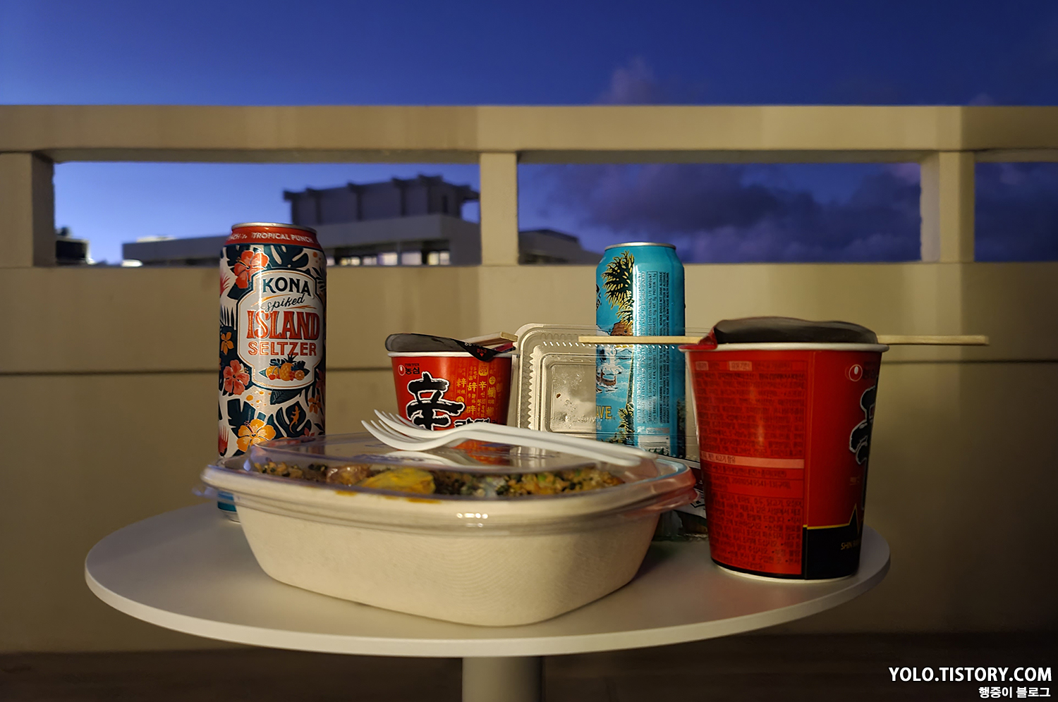 숙소에 들어오니 노을이 짙게 내렸다. 신라면 3개와 포케를 함께 먹으며 마지막 밤을 즐겼다. 코나 브루잉 맥주는 덤. 무스비는 배가 불러서 먹지 못했다. 짐을 정리하는데 여분으로 가져온 가방이 제 역할을 톡톡히 했다. 안 가져왔으면 꼼짝없이 캐리어를 구매했을 듯.. 지퍼백을 압축팩처럼 사용했는데, 다음 여행엔 압축팩을 구비할 필요성을 느꼈다.