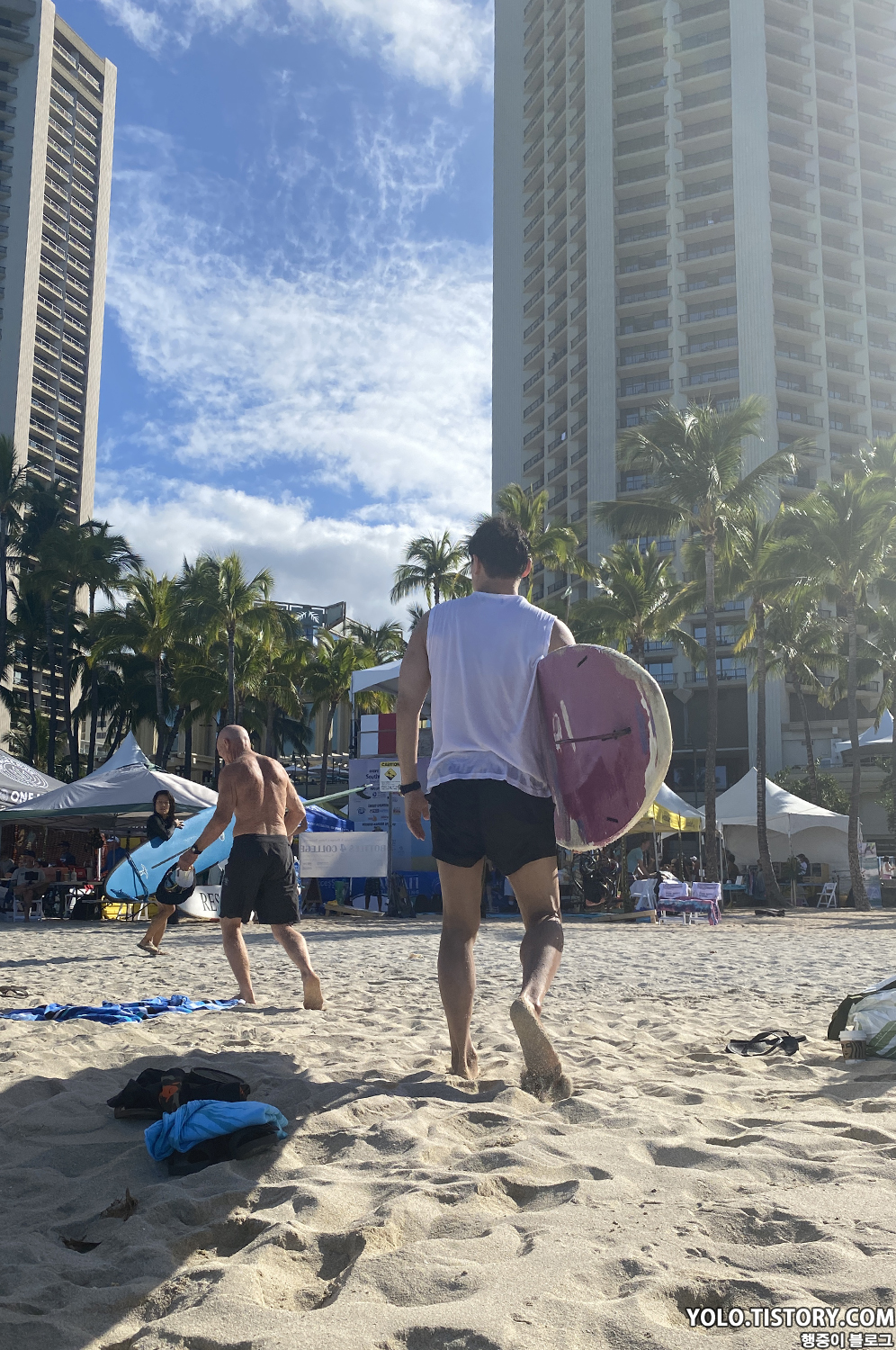 오늘은 하와이의 마지막 일정!. PCR 검사도 해야 하고, 기념품도 사야 하고, 짐 정리도 해야 하고 여간 바쁜 날이 아니었다. 하와이의 와이키키 해변에는 서핑하는 사람들을 많이 볼 수 있었는데, 일정 상 하지 못했다가 꼭 해야겠다는 마음을 먹고 새벽에 나서기로 했다.