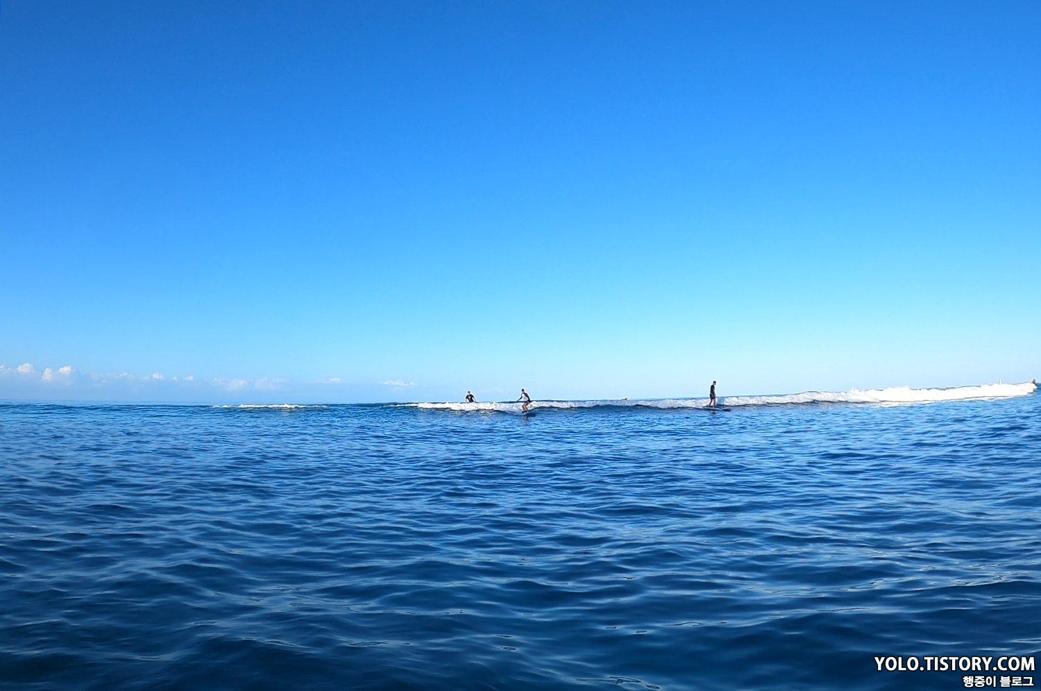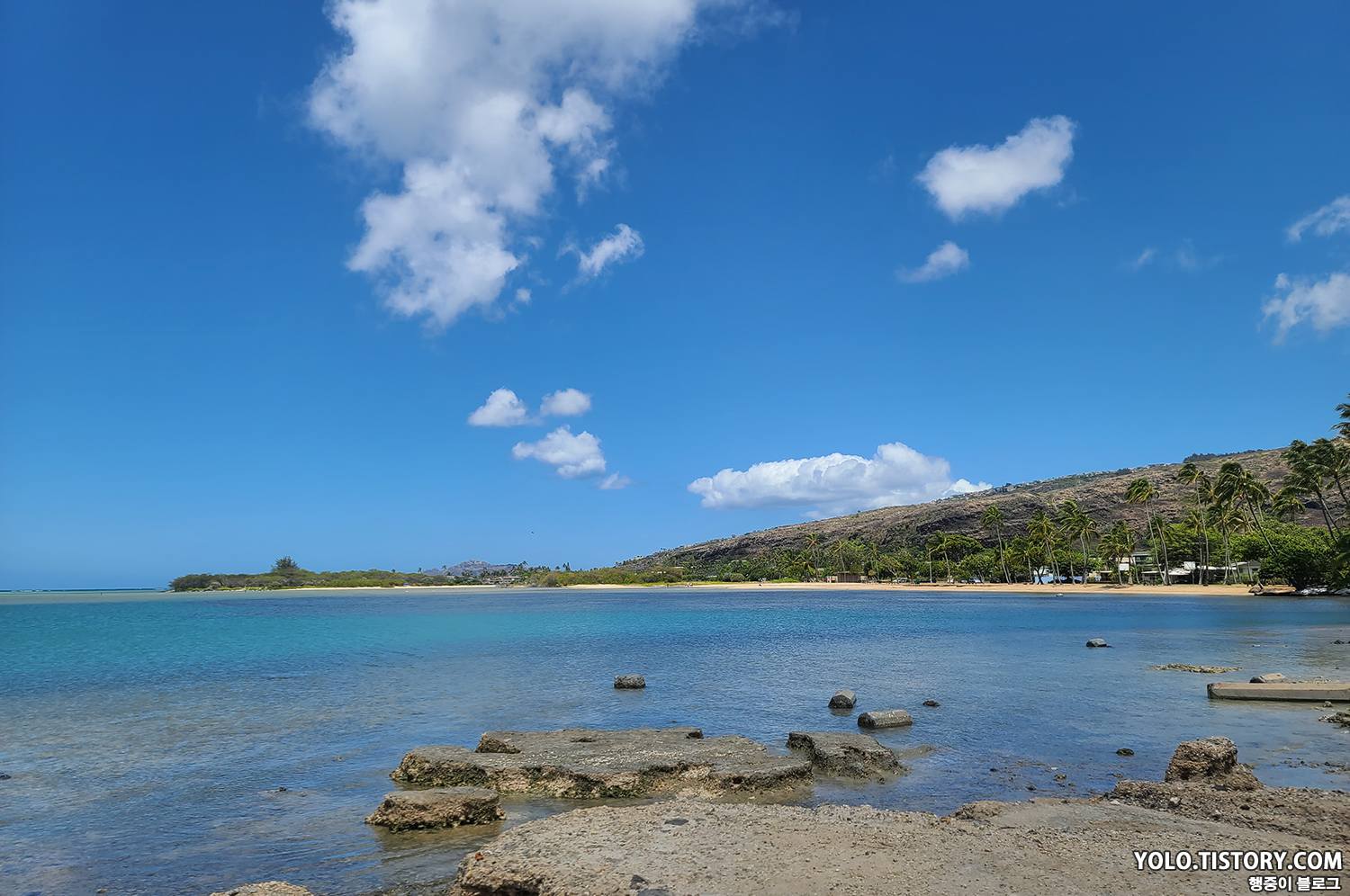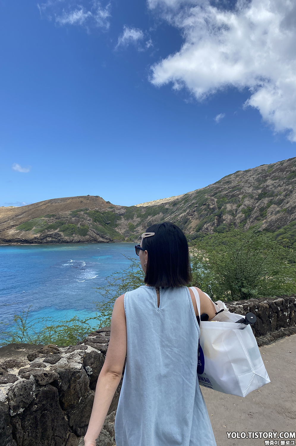 반납시간이 다되어 해변에 놓았던 짐을 찾으러 가니 아내가 나와 있었다. 옆방 아이의 울음소리에 깨어서 나왔다는데 내가 여기 있는 걸 어떻게 알았지?! 내가 서핑하는 영상을 찍었다고 했는데 다른 사람을 찍었다...ㅋㅋ 보드를 반납하고 숙소로 들어와 샤워 후 하나우마 베이로 출발!