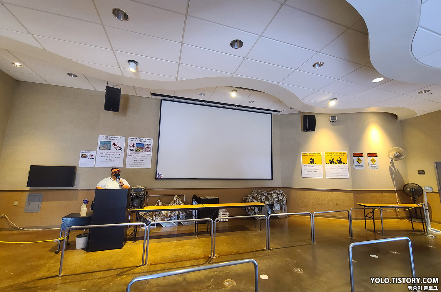 하나우마 베이 입구엔 직원들이 예약 여부를 확인했다. 11시 40분쯤 갔는데 12시 입장이라 하니 들여보내주었다. 주차 요금은 $3. 카운터에서 미리 예약한 정보와 여권을 보여주면 예약자 이름과 여권 이름들 대조한다. 입장 전엔 직원이 나와 유의사항을 안내해주고, 비디오를 보며 한번 더 주의사항을 알려준다.