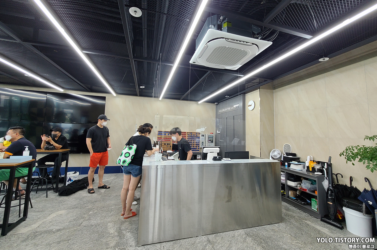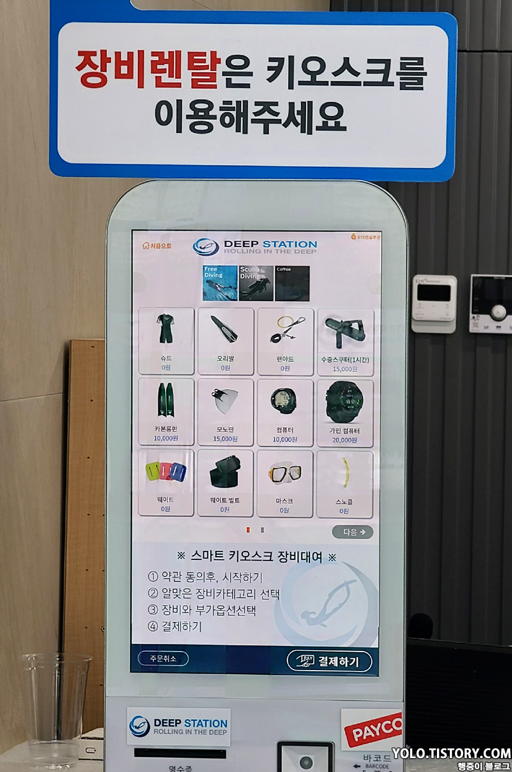 딥스테이션의 이용 요금은 3시간 기준 평일 44,000원 / 주말 66,000원이다. 비용이 꽤 비싸지만 슈트, 오리발, 마스크, 스노클 등등 기본 장비는 무료로 대여를 해준다. 프론트데스크에서 체크인을 하고 3층으로 이동하면 된다.