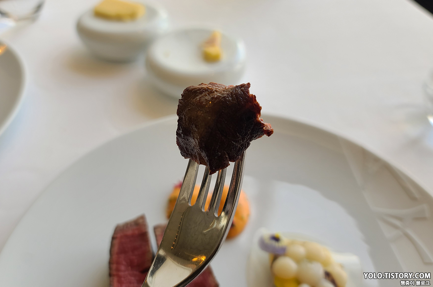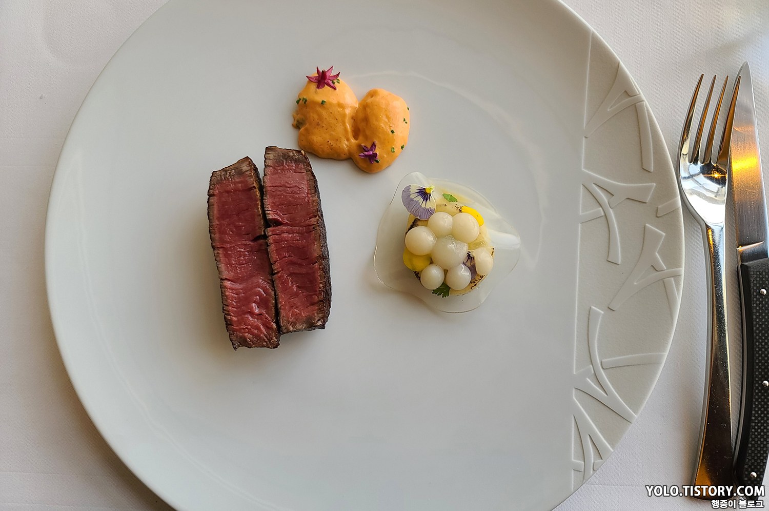 메인 메뉴로 나온 한우 스테이크. 알타리무와 스테이의 특제 소스인 쇼롱 소스가 같이 나온다. 스테이크 굽기는 무난했고 맛도 좋았다. 소스도 역시 괜찮았다. 문제는 양이 매우 적다는 것...