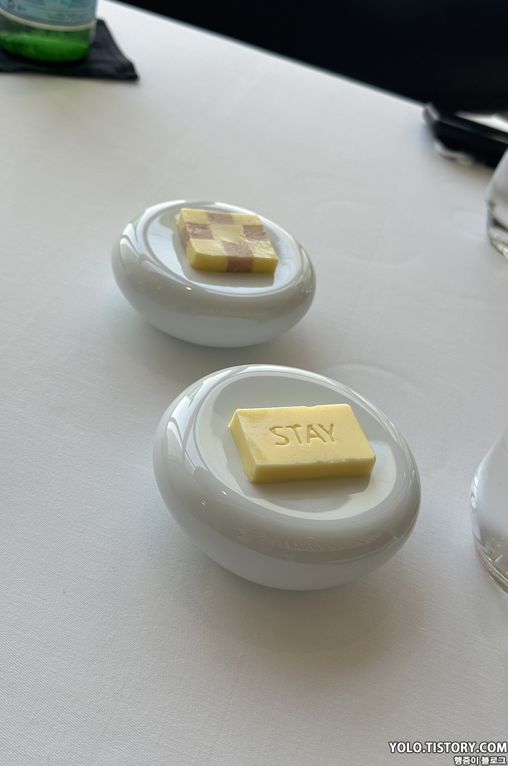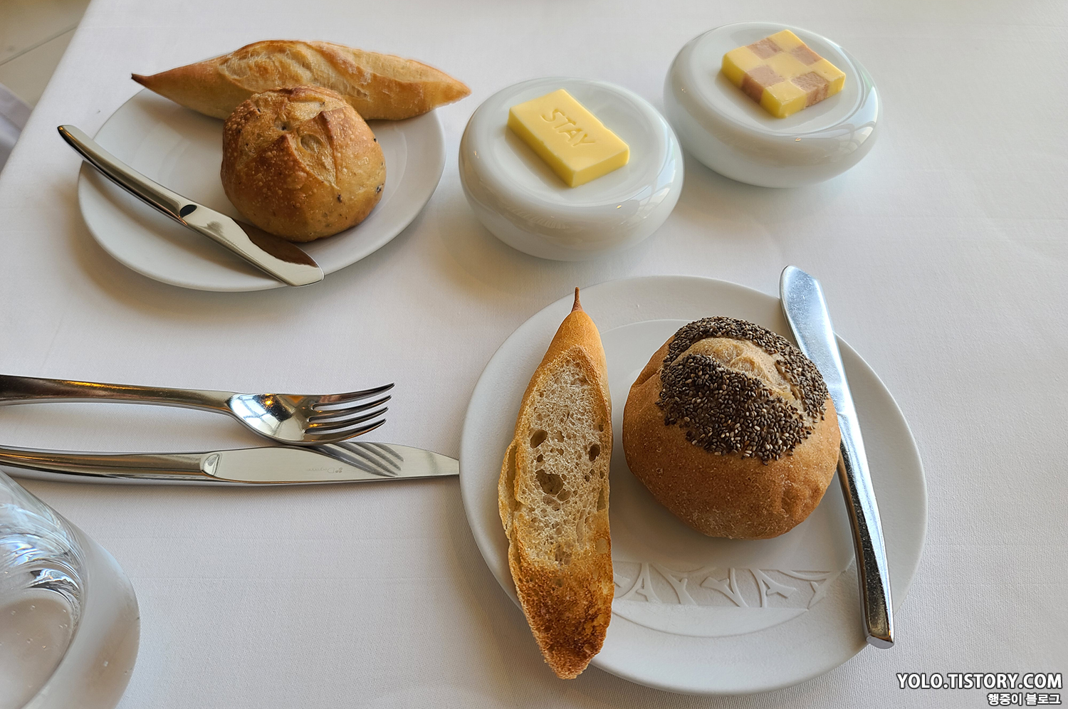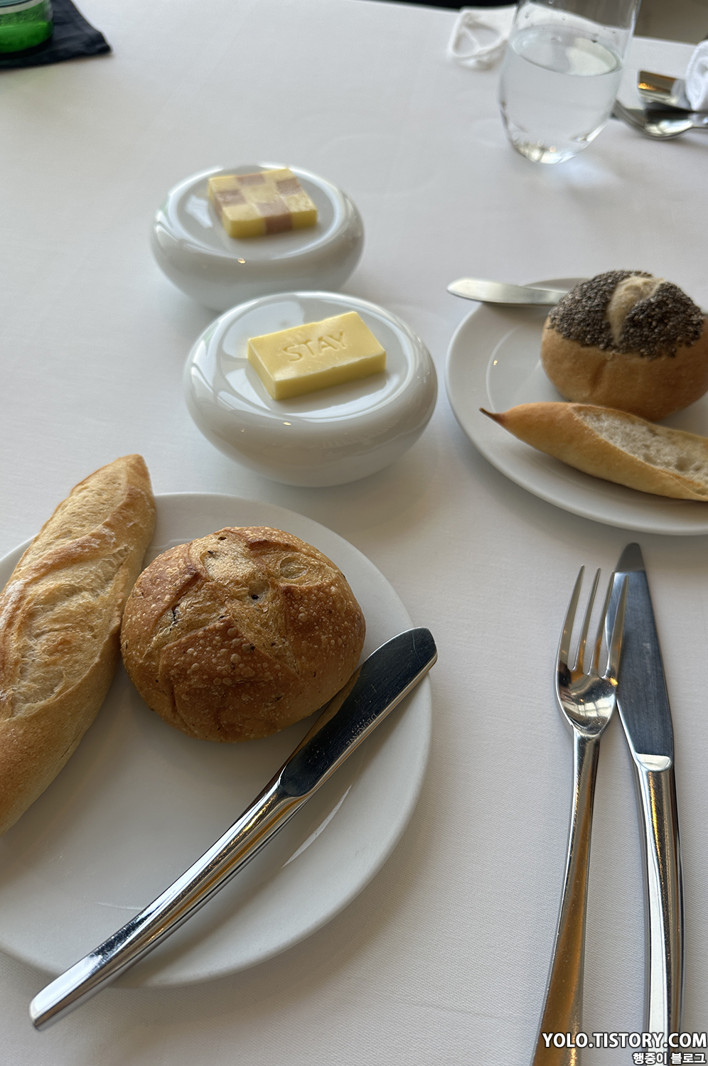 식전빵으로 바게트가 기본으로 제공되고 올리브와 호밀빵이었나.. 두 가지의 빵 중 하나를 골라 받을 수 있다. 기본 버터와 햄 버터 두 가지의 버터가 제공된다. 개인적으로 버터들이 맛있어서 한번 더 먹었다.