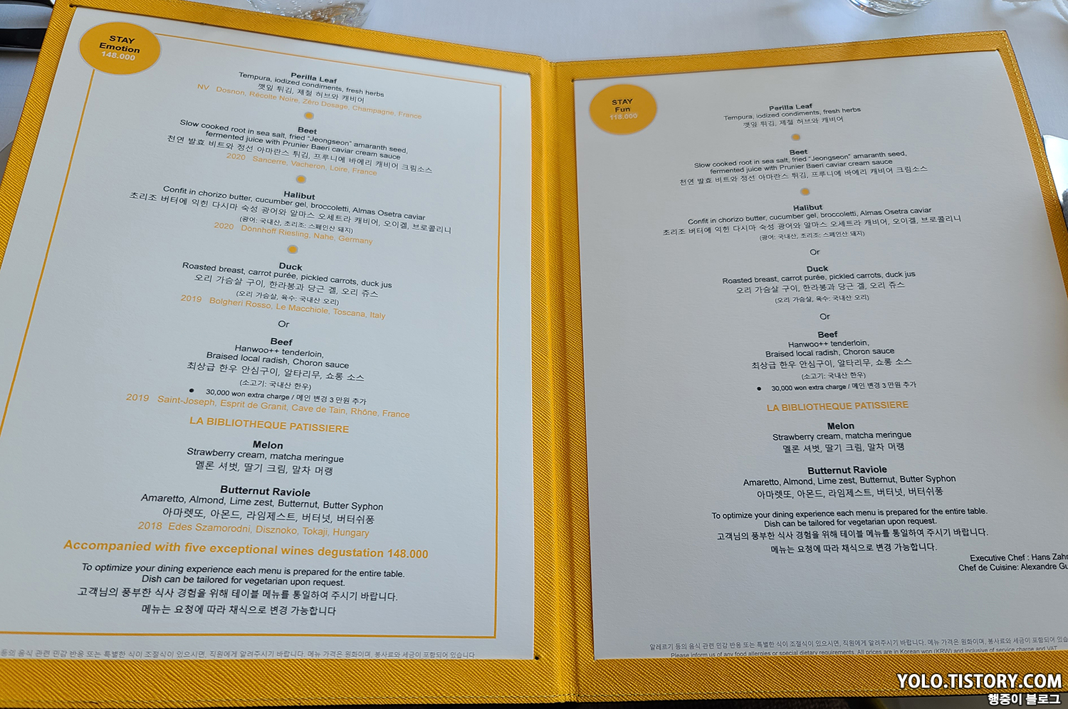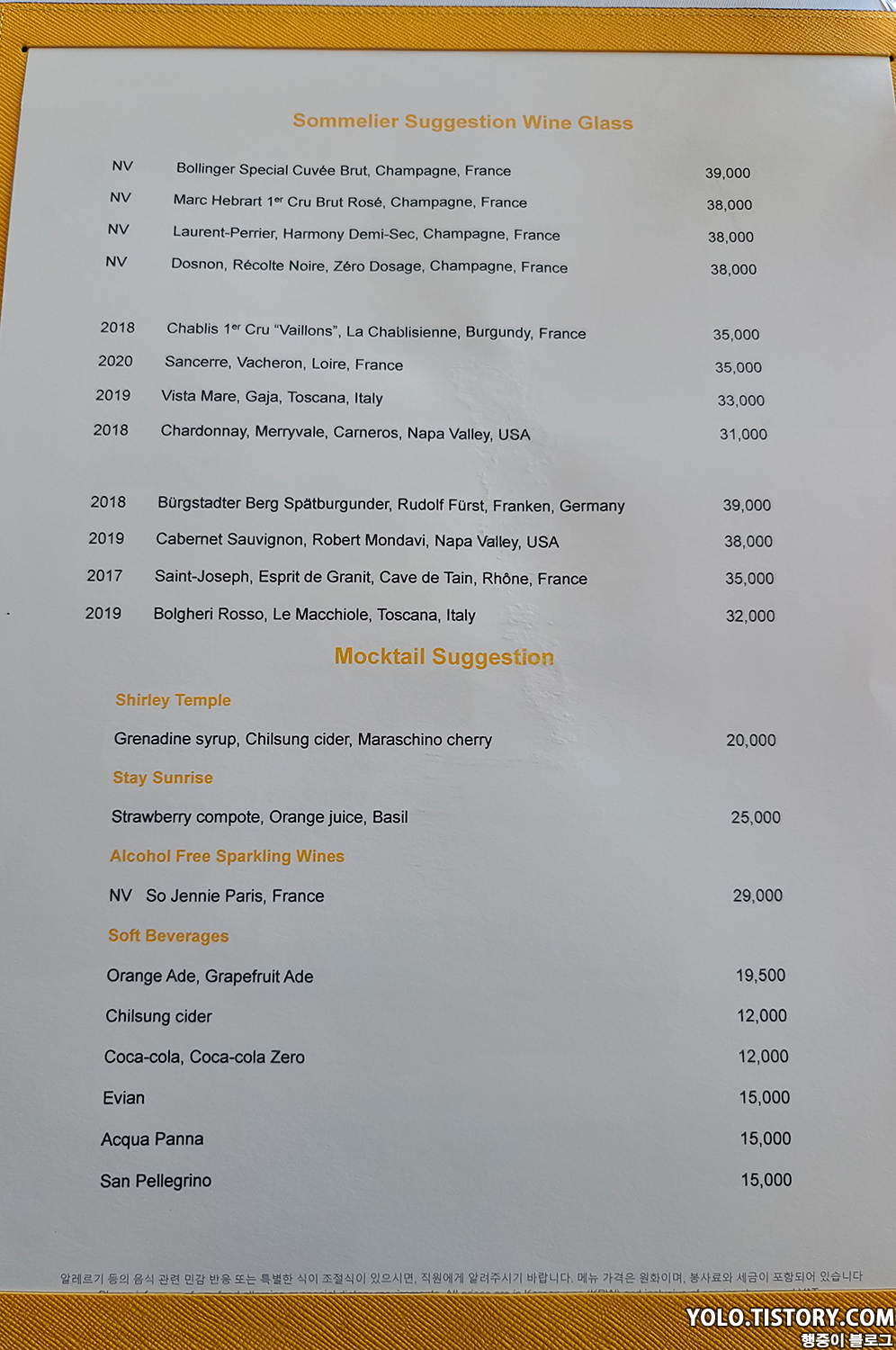 스테이의 점심 메뉴는 스테이 펀(118,000원) / 스테이 펀(148,000원)으로 구성되어 있다. 차이점이라면 광어요리가 추가 여부이다. 메인 메뉴는 기본으로 오리 가슴살 구이인데, 30,000원을 추가하면 한우 스테이크 요리로 변경이 가능하다. 스테이 펀에다 한우 스테이크로 변경 후 탄산 수(15,000원)를 주문했다. 콜라도 12,000원이나 하는 극악의 가격을 보여준다...;