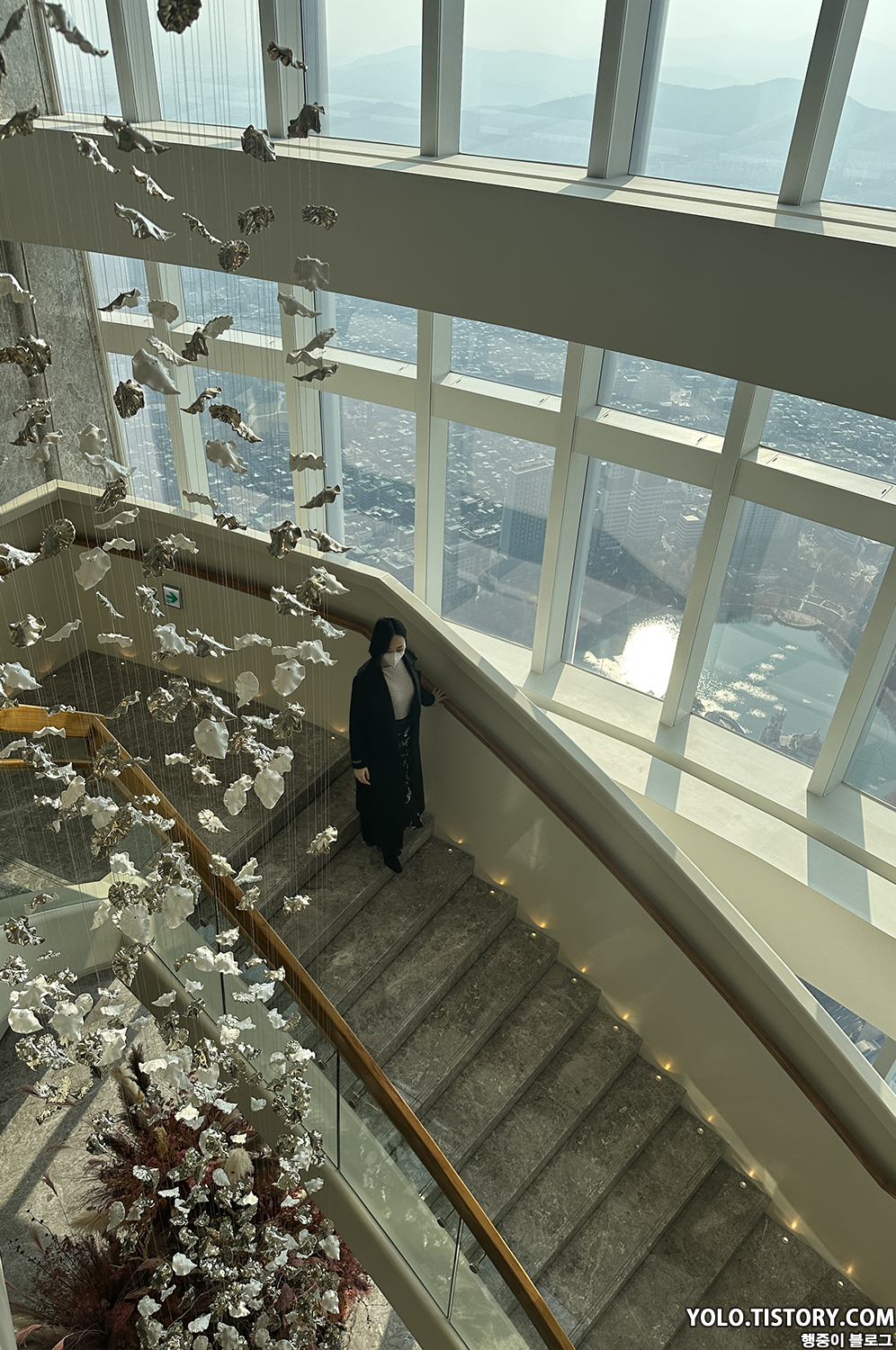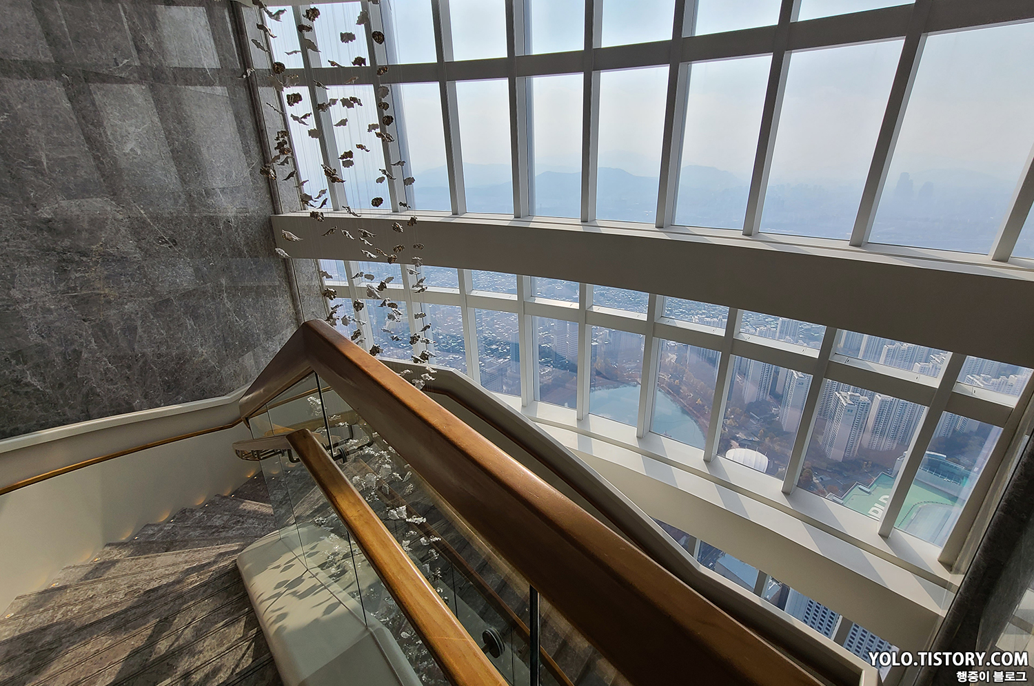 내려가는 엘리베이터 앞에 시그니엘 로비로 이어진 계단이 있다. 이 쪽에서 단풍이 아름답게 물들어 있는 롯데월드의 모습이 한눈에 보인다. 포토스팟으로 제격인 듯.
