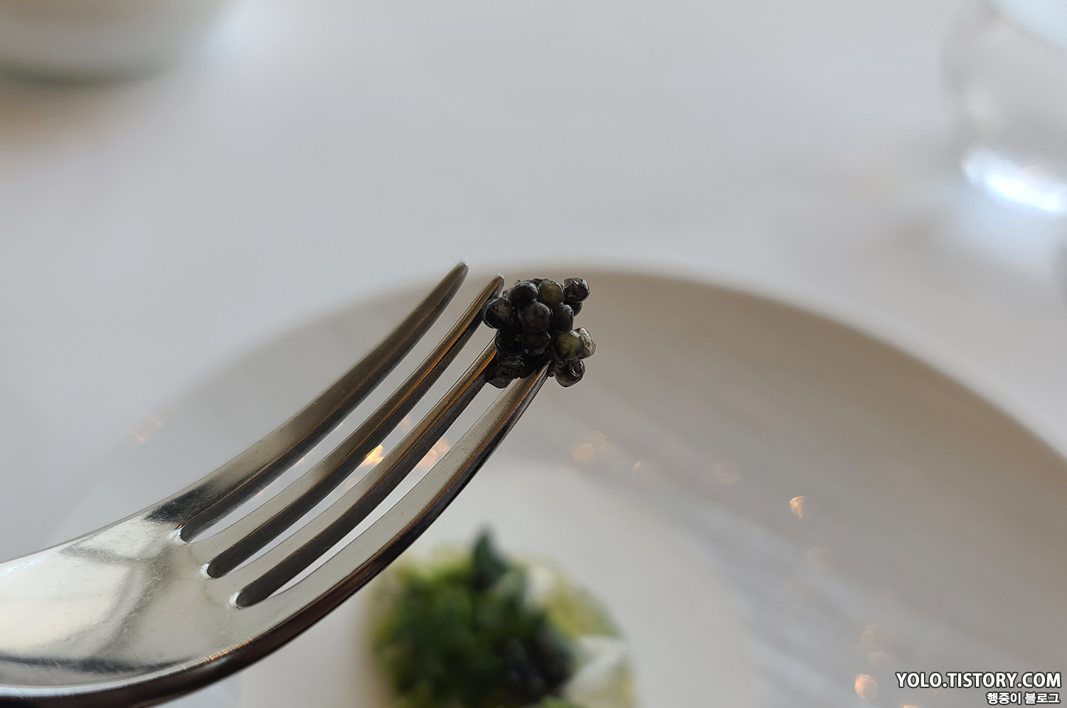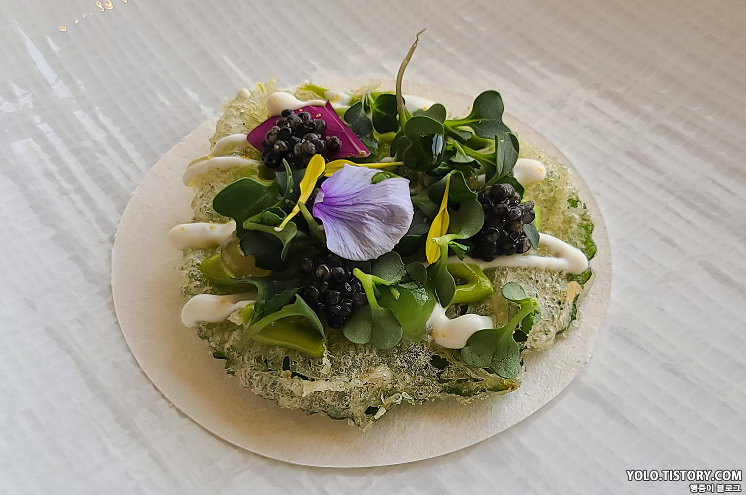 애피타이저로 나온 깻잎 튀김. 바삭한 식감이 좋았다. 시그니엘 스테이의 점심 메뉴엔 메인 메뉴를 제외하고 모두 캐비어가 들어간 듯했다.