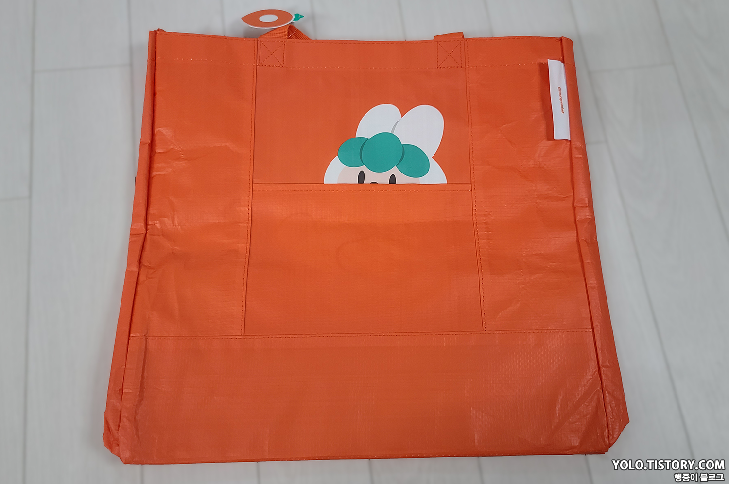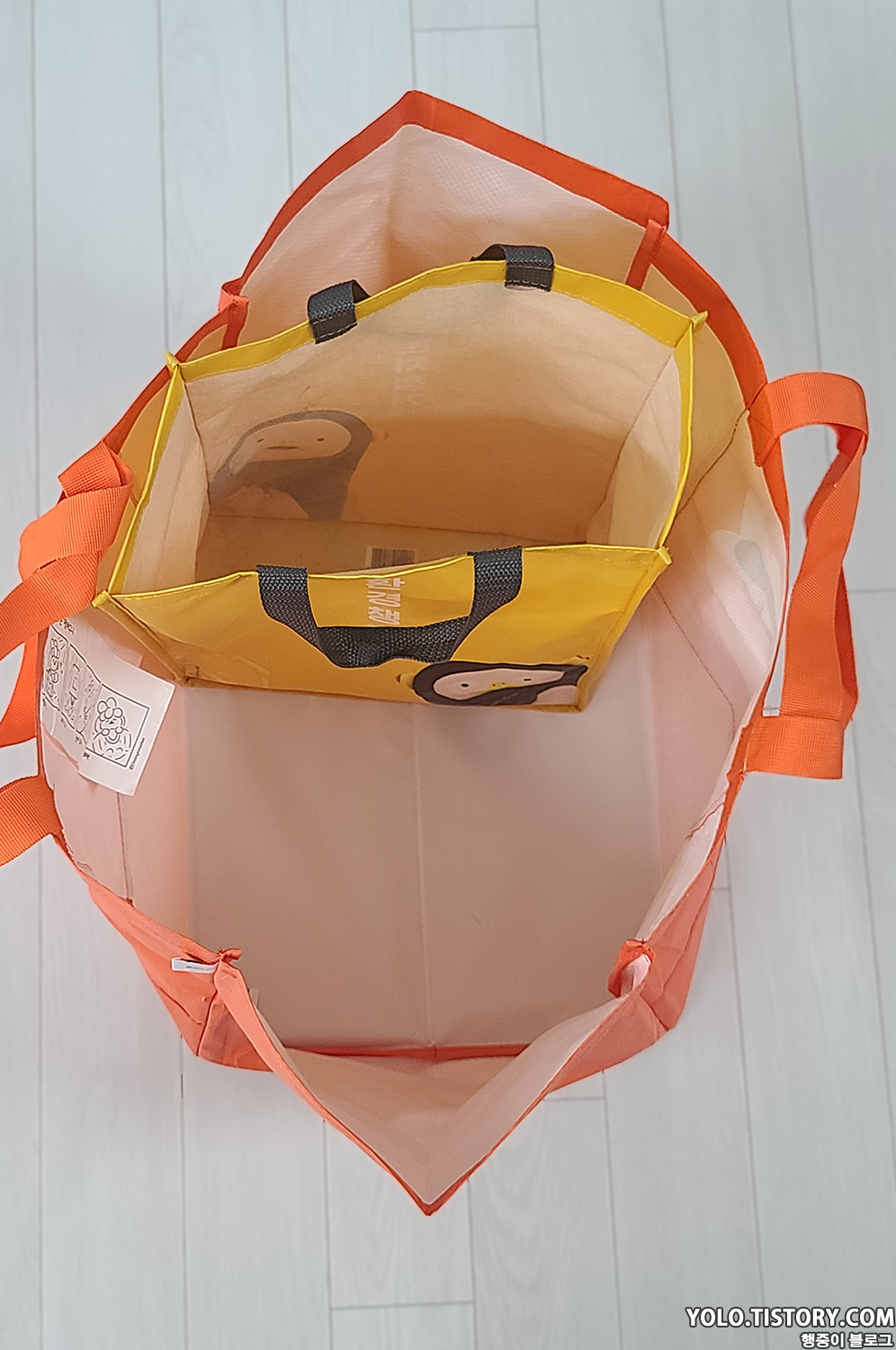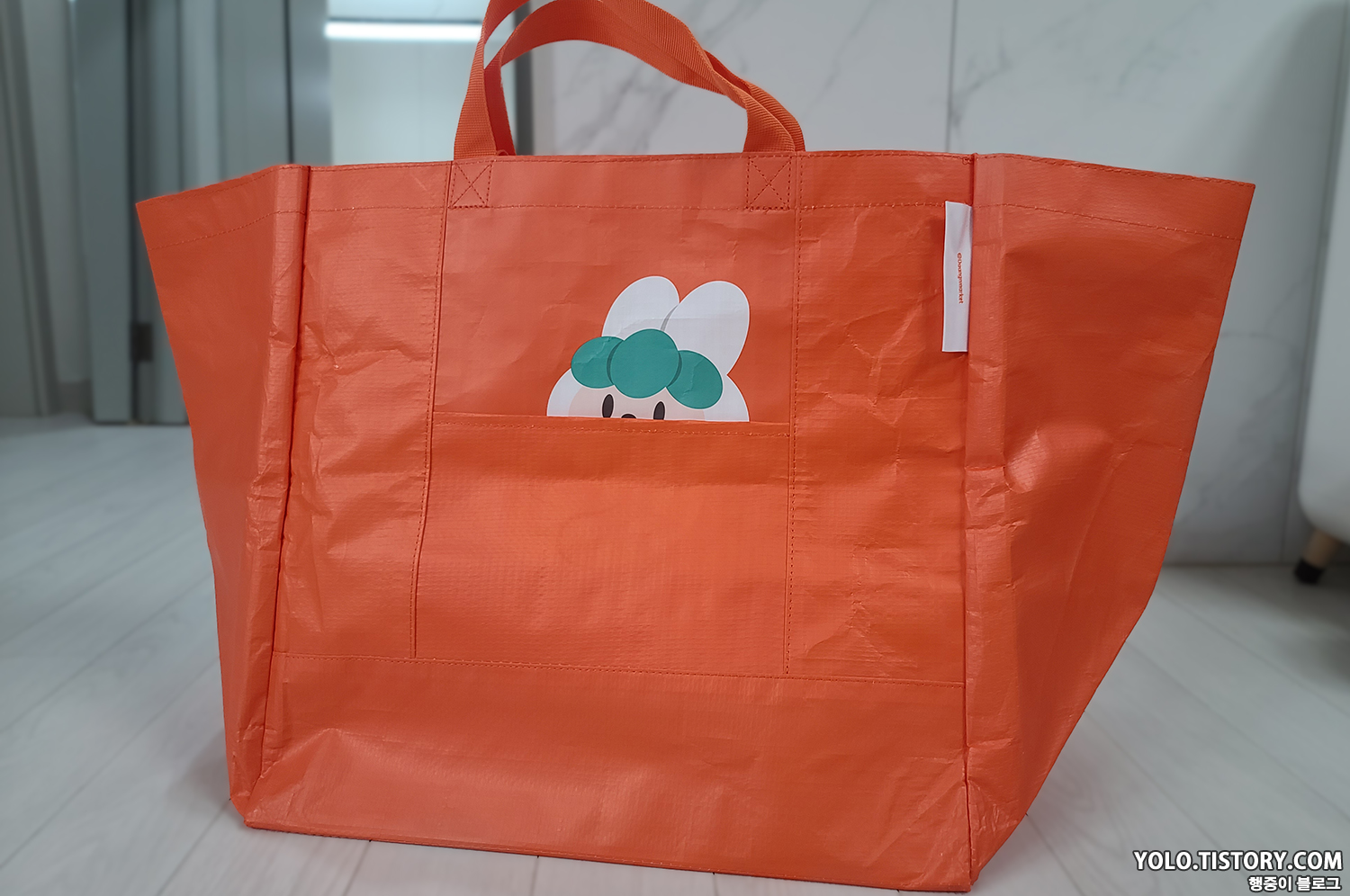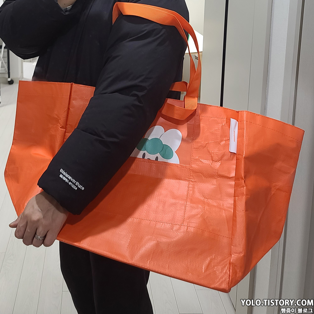 국민 장바구니인 이마트 장바구니와 비교. 이마트 장바구니를 3개 정도 합친 크기라고 보면된다. 5L짜리 스너글이 3통까지는 들어갈만한 크기. 사이즈가 넉넉해서 장볼때 아주 유용하게 쓸 것 같다.