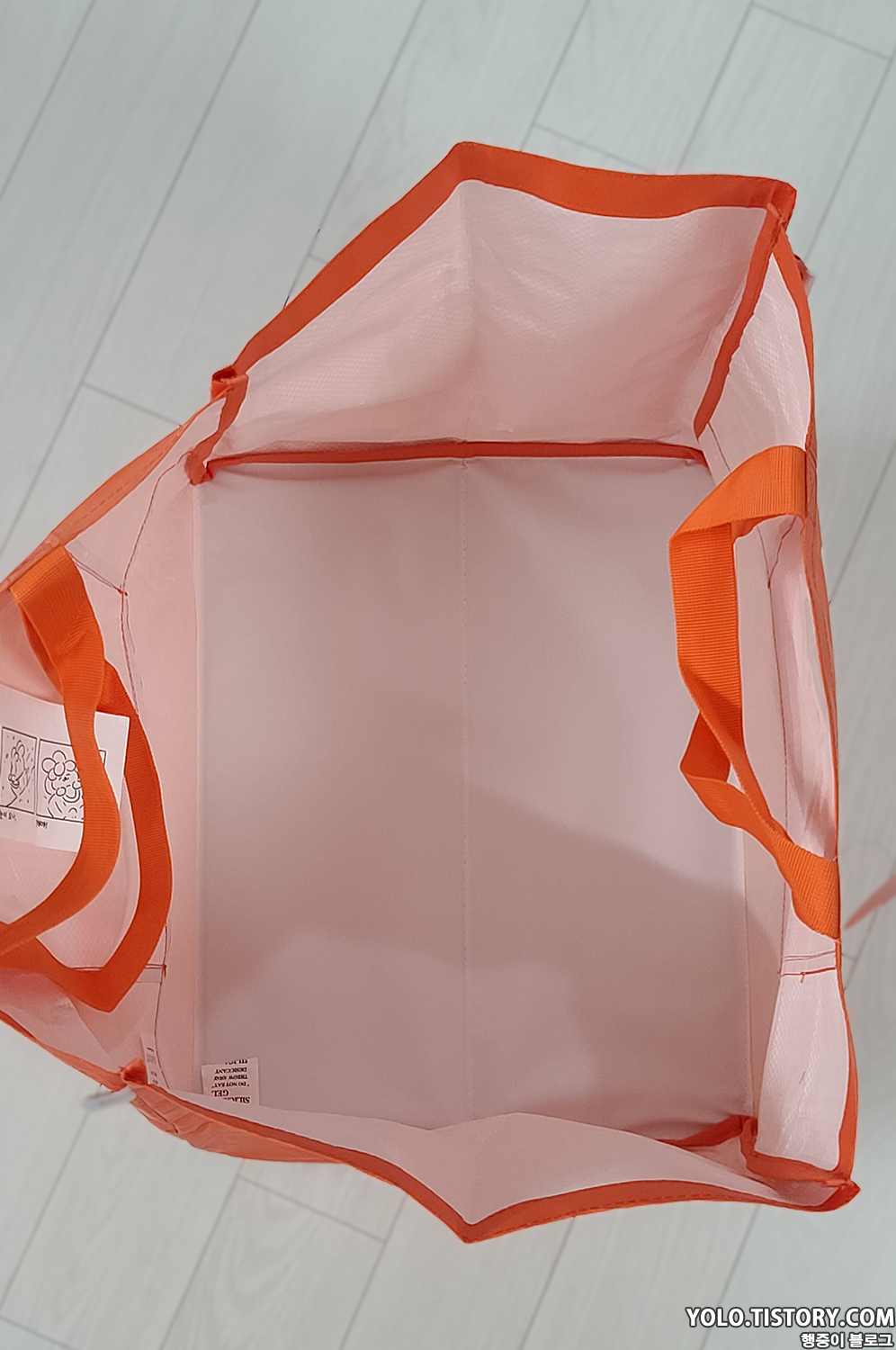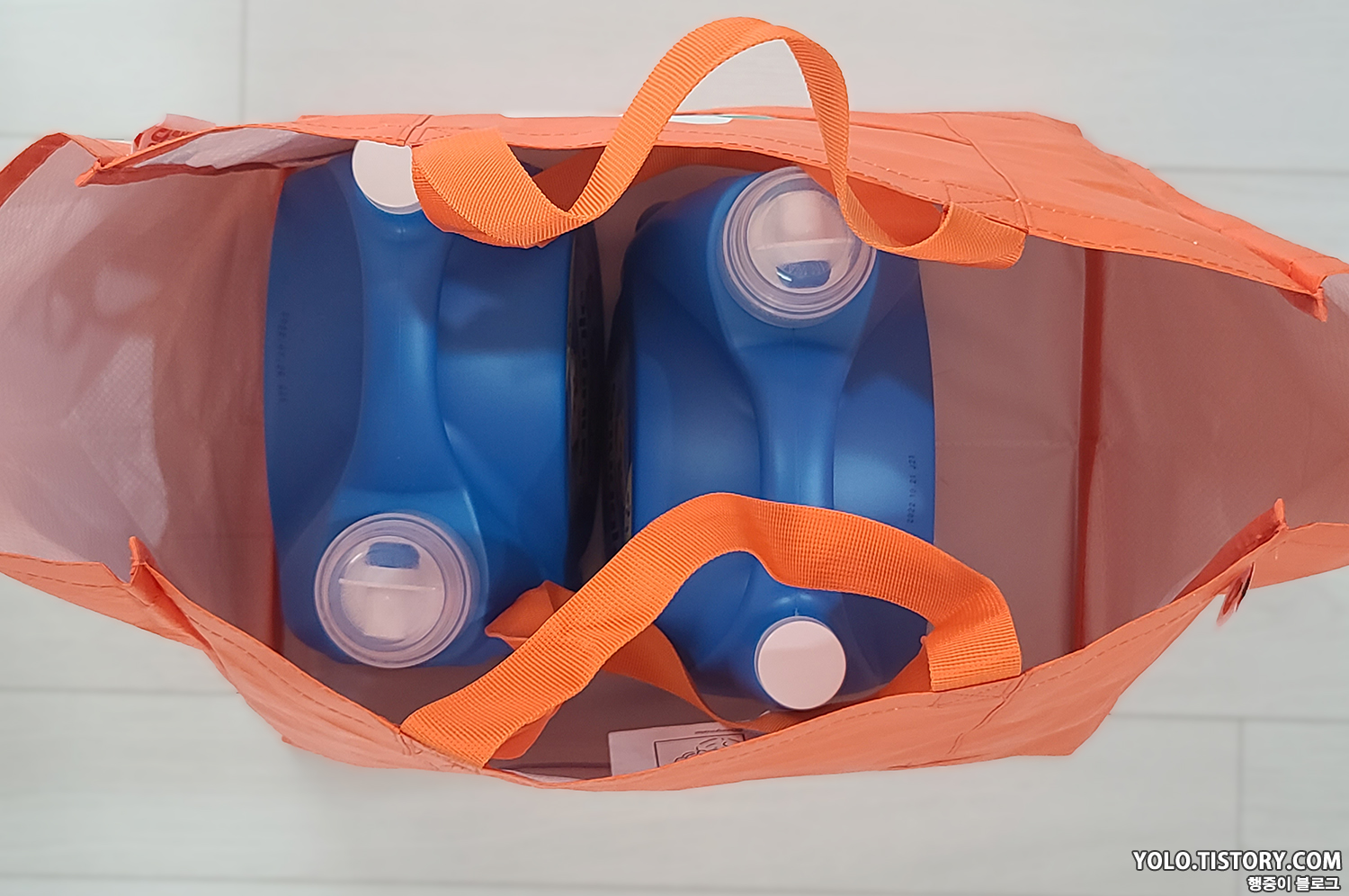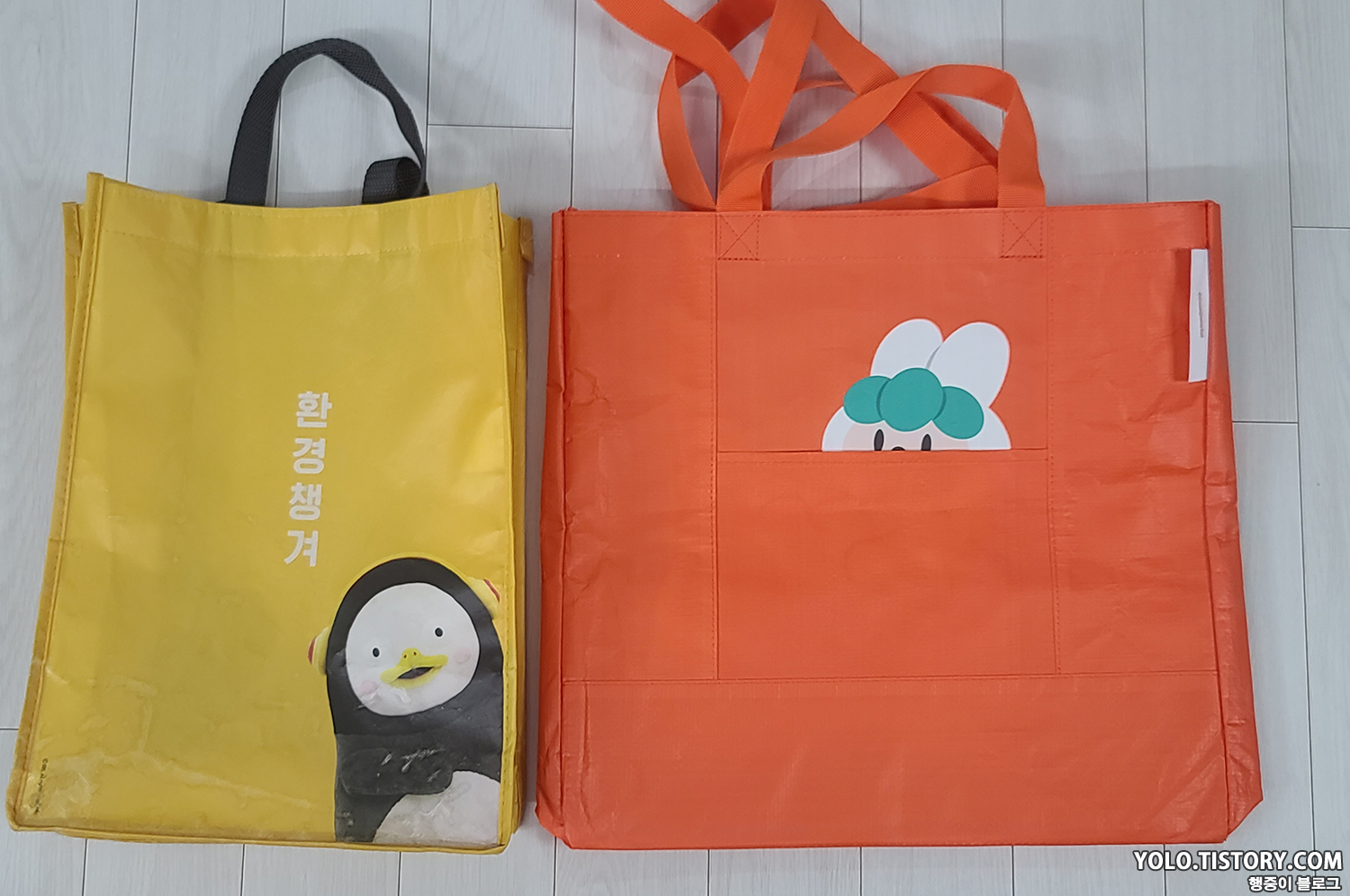 국민 장바구니인 이마트 장바구니와 비교. 이마트 장바구니를 3개 정도 합친 크기라고 보면된다. 5L짜리 스너글이 3통까지는 들어갈만한 크기. 사이즈가 넉넉해서 장볼때 아주 유용하게 쓸 것 같다.