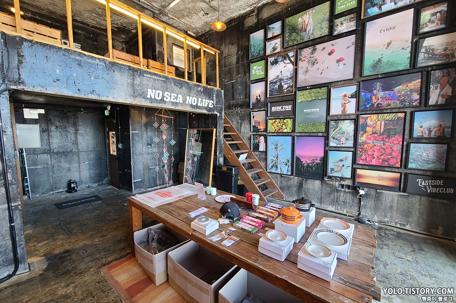 반대편엔 각종 머천다이즈들이 판매되고 있다. 사진에 걸린 그림은 직접찍은 이스트사이드바이브클럽의 패밀리 사진인 듯 했다. 만약 고성에 다시가게 된다면 꼭 한번 더 들르고 싶은 카페이다. 여름에 오면 느낌이 다를 것 같아 보인다!