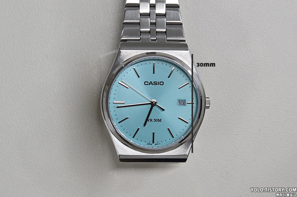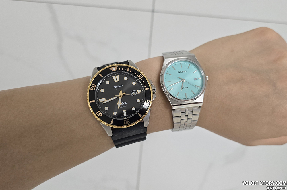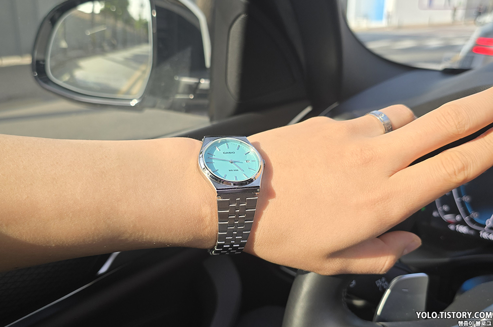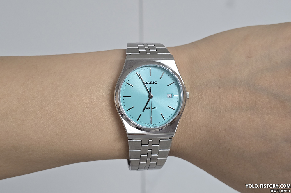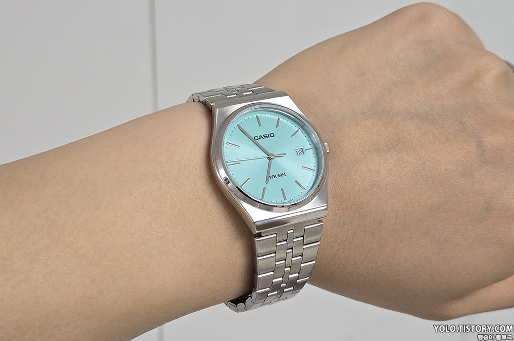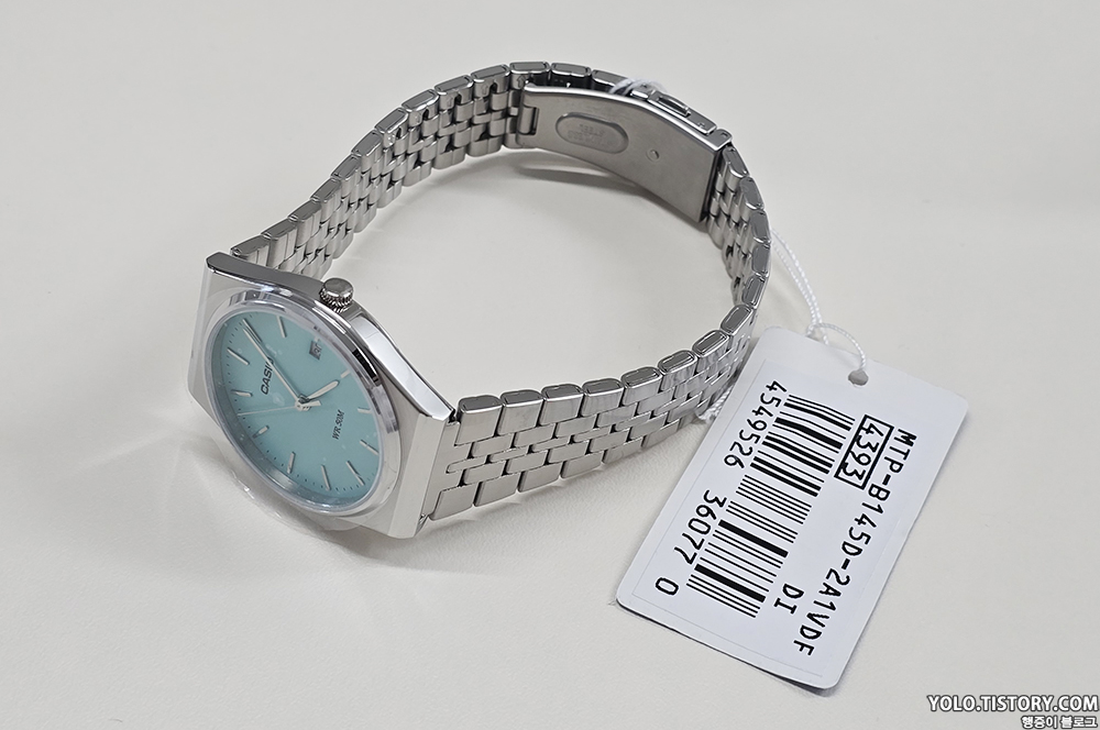 카시오 빈티지 컬렉션에서 선보이는 모델 MTP-B145D-2A1VDF을 구매했다. 국내 발매가는 105,000원이지만, 티파니앤코를 떠올리게 하는 해당 모델의 색상 때문에 정가에 구하기가 쉽지 않다. 미국 아마존을 통해 구매했고 완충제 포장이 되어있지 않아 케이스가 다 파손되어 도착. 다행히 제품에 이상은 없었다. 티쏘의 PRX 느낌도 풍기는 제품.