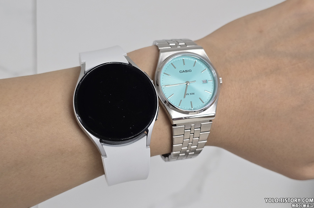 카시오 흑새치와 갤럭시 워치 40mm 모델과 비교. 확실히 작은 느낌이 든다.