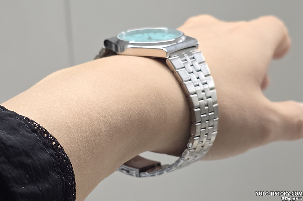 더콰이즈 블루의 청량한 색상이 여름에 잘 어울릴 듯 하다. 손목의 시원한 포인트로 올여름 야무지게 잘 착용하고 다닐 것 같다.
